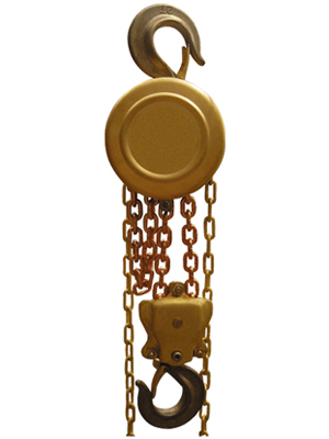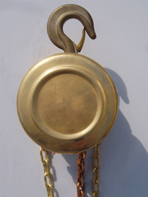 通過拽動手拉鏈條帶動手拉鏈輪、摩擦片、棘輪、制動器座、五齒長軸、片齒輪、短軸齒輪、花鍵孔齒輪、起重鏈輪轉動,最終帶動起重鏈條平穩(wěn)的吊運重物。